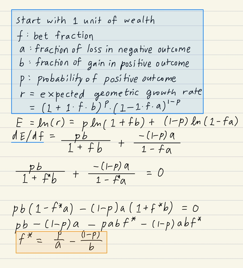 Kelly Criterion calculates the optimal betting fraction given the expected outcome and probability for both negative and positive scenarios. Optimal means the highest expected geometric return. The proof follows below.